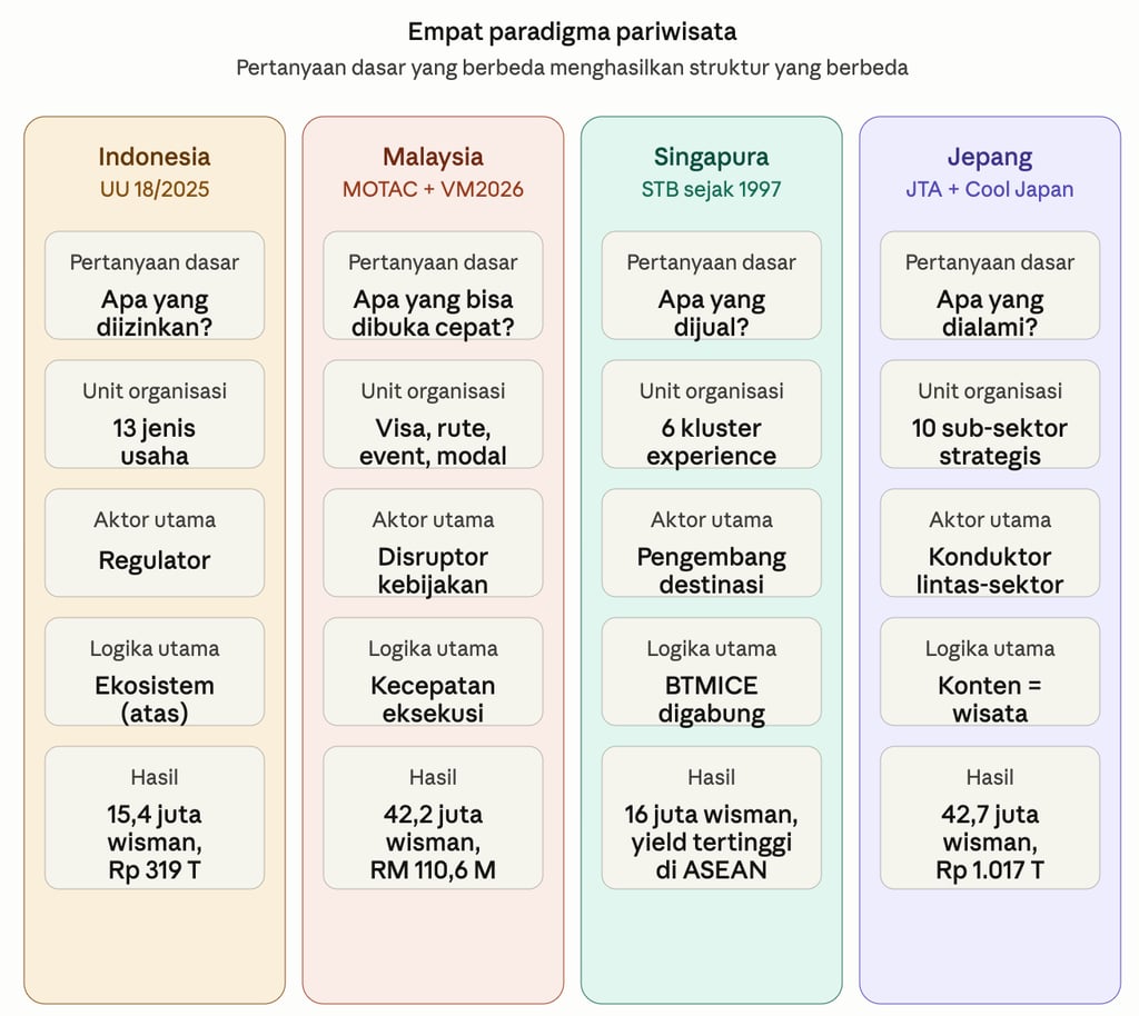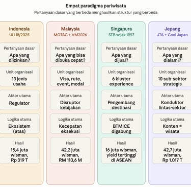 Indonesia, Malaysia, Singapura, dan Jepang, meski sama-sama negara Asia yang serius membangun pariwisata, sesungguhnya berangkat dari empat paradigma yang fundamental berbeda. Perbedaan ini bukan soal kompetensi. Bukan soal dana. Bukan soal sumber daya. Yang membedakan adalah pertanyaan dasar yang mereka tanyakan pada diri sendiri ketika merumuskan kebijakan pariwisata. Dan pertanyaan yang berbeda — di situlah akar dari semua takdir yang berbeda.