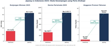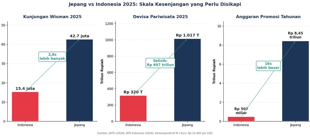 Grafik 2. Tiga dimensi kesenjangan Jepang vs Indonesia pada 2025. Kunjungan 2,8 kali lebih banyak, devisa selisih Rp 697 triliun, anggaran promosi 16 kali lebih besar. Sumber: JNTO, BPS Indonesia, Kemenparekraf.