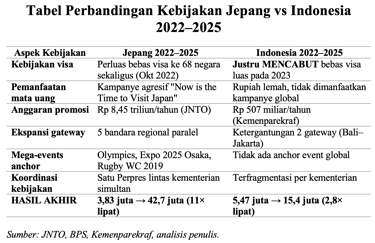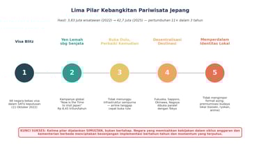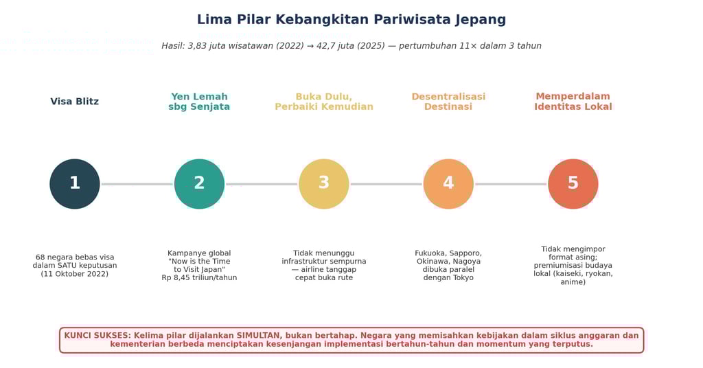 Grafik 3. Lima pilar kebijakan yang dijalankan Jepang secara simultan sejak Oktober 2022. Kombinasi ini membawa kunjungan dari 3,83 juta (2022) ke 42,7 juta (2025) — pertumbuhan 11 kali lipat dalam tiga tahun