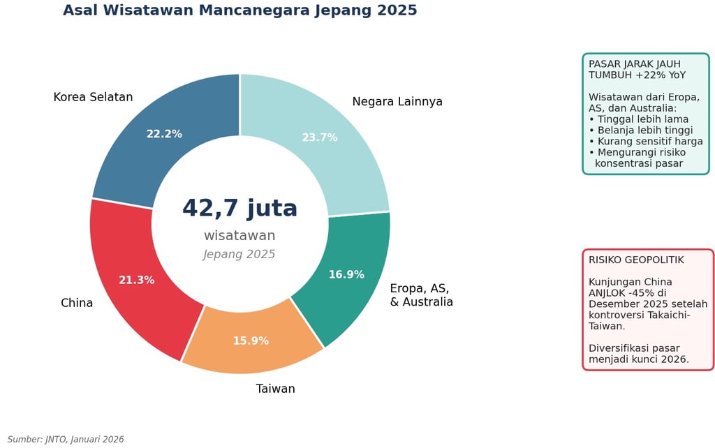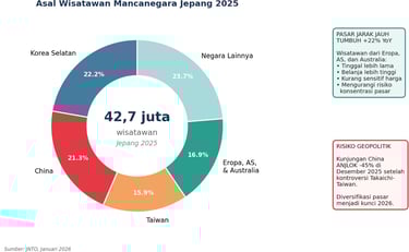 Grafik 4. Komposisi asal wisatawan Jepang 2025. Pasar jarak jauh (Eropa, AS, Australia) tumbuh +22% YoY — mengimbangi risiko geopolitik penurunan wisman China −45% di Desember 2025. Sumber: JNTO.