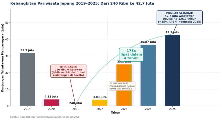 Dalam lima tahun terakhir, lintasan pariwisata Jepang mengalami dinamika yang ekstrem. Pada 2019, sebelum pandemi, Jepang menerima 31,9 juta wisatawan — angka rekor yang dibanggakan. Pandemi COVID-19 meluluh-lantakkan industri: 2020 hanya 4,11 juta (turun 87%), 2021 anjlok ke 240.000 (turun lagi 94% dari 2020). Pembukaan perbatasan di akhir 2022 membawa Jepang ke 3,83 juta, lalu melonjak ke 25,1 juta pada 2023 dan 36,87 juta pada 2024. Kini, 2025 mengakhiri siklus pemulihan dengan angka tertinggi dalam sejarah Jepang: 42,7 juta.