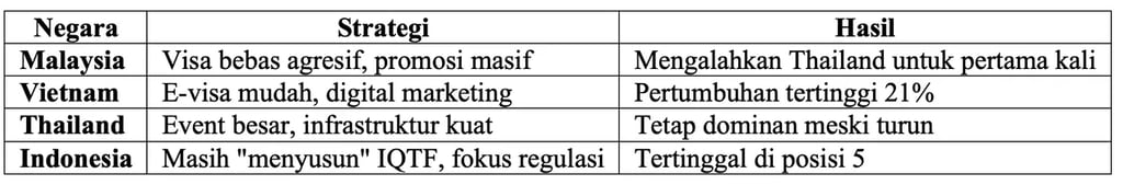 Sementara itu, Indonesia Quality Tourism Fund (IQTF) yang digembar-gemborkan masih berada dalam tahap "penyusunan Peraturan Presiden." Kontras dengan Malaysia yang dengan sigap mengeksekusi strategi visa bebas dan promosi agresif, atau Vietnam yang berhasil meraih pertumbuhan 21% melalui digitalisasi dan simplifikasi prosedur, Indonesia terjebak dalam labirin birokrasi dan regulasi.