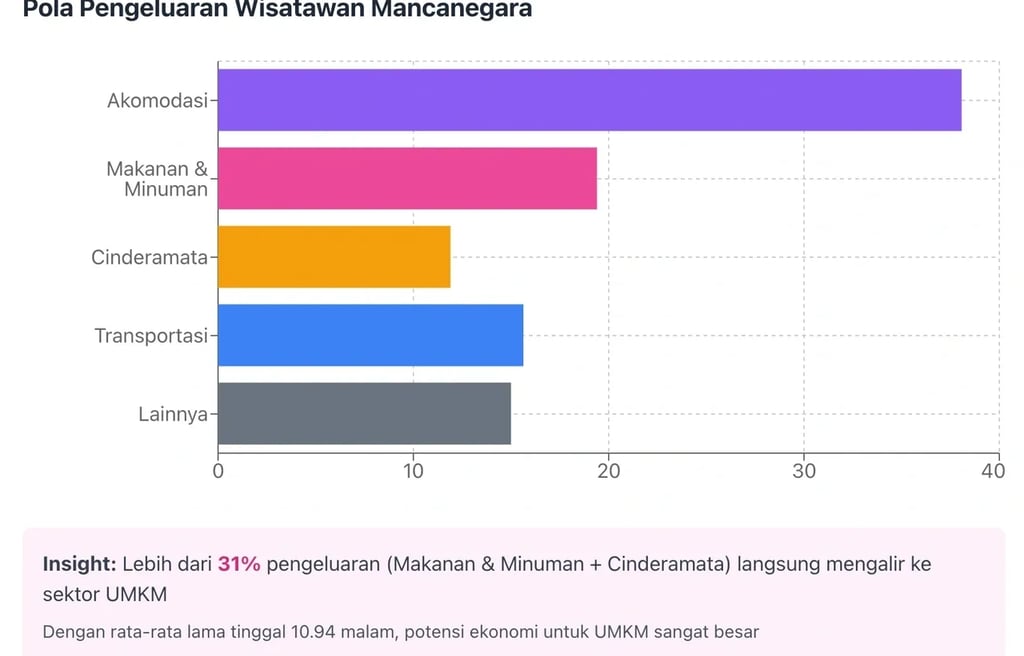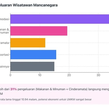 Pola pengeluaran wisatawan mancanegara kuartal I 2025 membuktikan hal ini: setelah akomodasi (38,07%), makanan-minuman menjadi pos terbesar kedua (19,40%), diikuti cinderamata (11,90%). Lebih dari 31 persen pengeluaran langsung mengalir ke sektor yang didominasi UMKM. Dengan rata-rata lama tinggal 10,94 malam dan target 14,6-16 juta kunjungan wisman 2025, potensi ekonomi untuk UMKM mencapai triliunan rupiah.