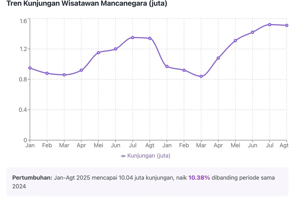Indonesia tengah berada di persimpangan jalan emas. Kunjungan wisatawan mancanegara Januari-Agustus 2025 mencatat rekor 10,04 juta—tertinggi sejak pandemi dengan pertumbuhan 10,38 persen.